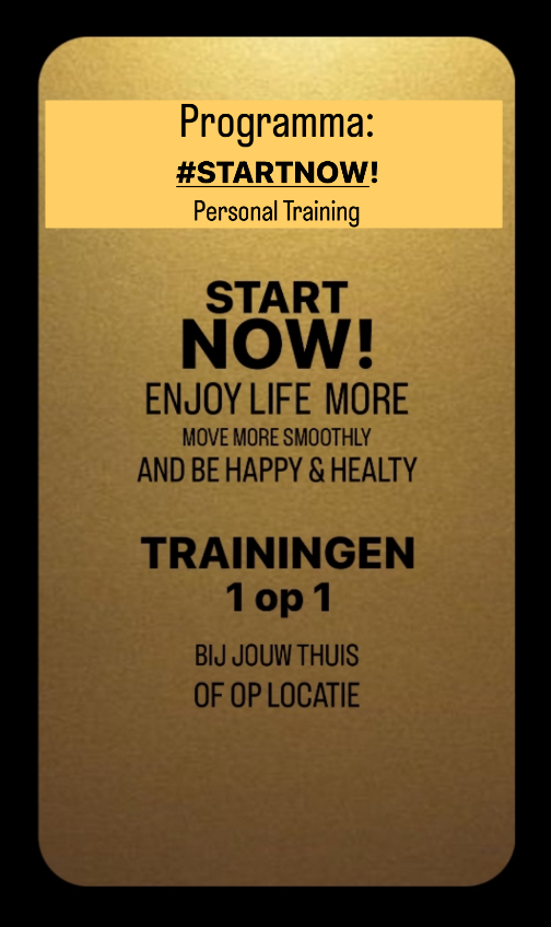 PT in het programma #STARTNOW! geeft je de mogelijkheid om op elk moment van de dag te trainen wanneer jou het beste uitkomt. De duur bepaal je zelf, met uiteraard advies van mij. Je zit ook nergens aan vast. Samen stellen we een doel en wordt er een programma gemaakt. Vanuit daar starten we en sturen we bij waar nodig.